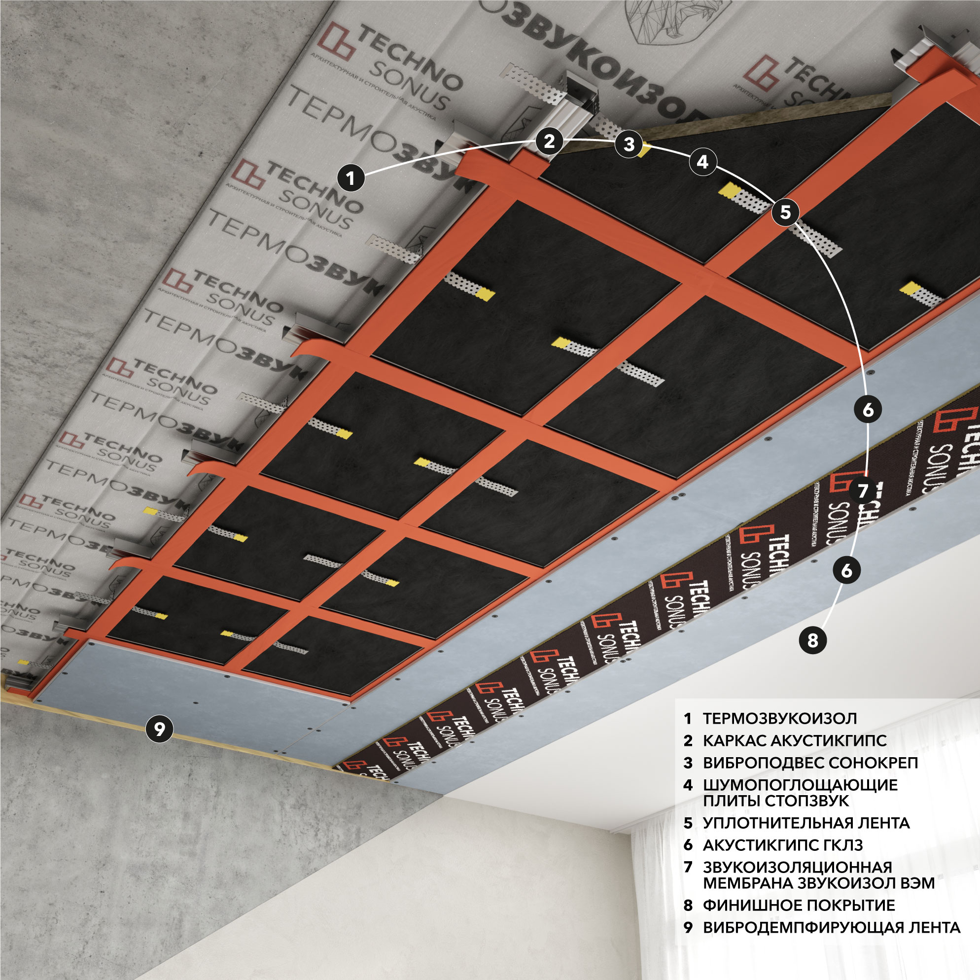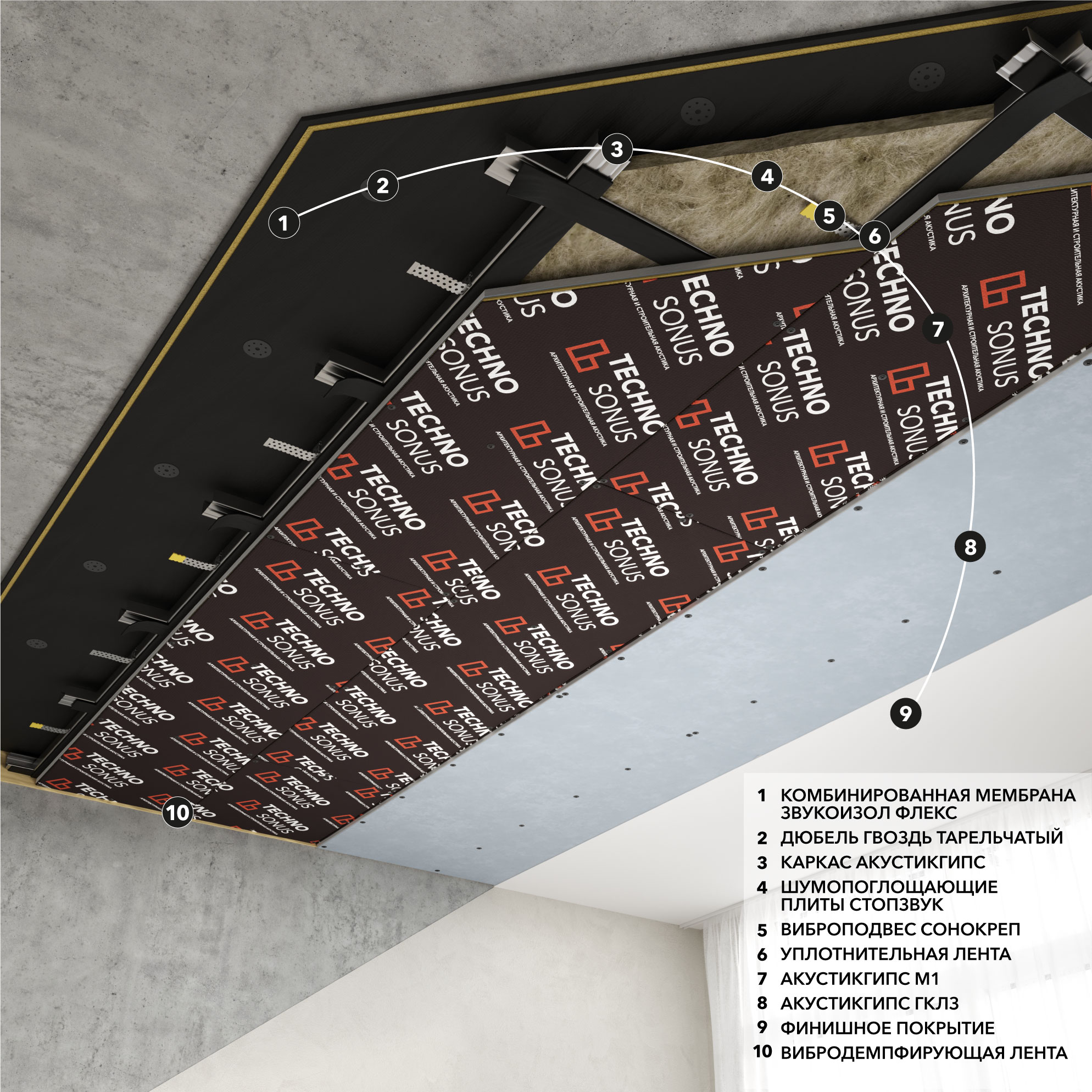 В данном разделе приведены типовые схемы монтажа звукоизоляции потолка с применением материала Звукоизол ВЭМ, Звукоизол ФЛЕКС, комбинированной панели АкустикГипс М1 (с тяжелой вязкоэластичной мембраной).